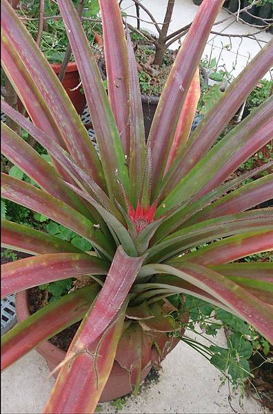這應該是前年吃完鳯梨後插入盆裁的吧~因為真的不記得日期了.最近中心開始變紅..仔細一看...哈哈...快要有鳯梨可以吃囉~